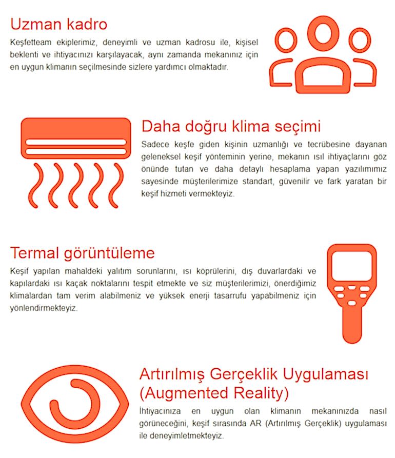 Ke�fetteam Nedir? Ke�fetteam, Mitsubishi Electric�in m��teri memnuniyetini en �st seviyede tutarak olu�turdu�u, sekt�rde daha �nce hi� kar��la��lmam�� bir ke�if s�reci hizmetidir. Ke�fetteam ekipleri �zel geli�tirilmi� Ke�fetteam uygulamas� ile en do�ru analizi yaparak, beklentilerinizi ve mekan�n�z�n ihtiyac�n� kar��layacak en uygun klimay� se�menizde size yol g�sterir.